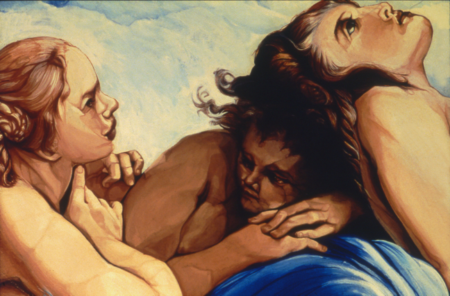 The first few weeks were very exciting. We found problems and unorthodoxly solved them, laughing a lot, acting the fools and creating a lot of curiosity in the general public. I had generous help from a lot of people, in fact, someone came in every day. Bernice was very helpful as a fellow trained artist, she did a lot of the squaring-up and drawing of the cupids and helped with the placement of them. Having just had a bit of fun with angels and cupids in some recent etchings (using them as symbols of daydreaming and syrupy idealism), the higher parts of the walls just asked for a couple. So I started from the top, with a hasty decision to put three Amazon ladies over the archway, following classical solutions to architectural painting. I am fascinated by fantasy and realism, exact opposites, yin and yang, good and evil. The idea of three Rubenesque naked women floating around on clouds like seas and fat babies with old faces and little wings whizzing about in our carbon monoxide air traffic corridors, was very appealing. Instead of pilots having trouble with seagulls, the message from plane to tower would be “Cupid has been sucked into engine number three and we are being bombarded by large angry naked mothers. Arrows are being shot into the fuselage. Is Superman coming to reprimand us?” Imagine what havoc they could create with the early warning system of the Super Power's The three ladies took up a lot of time as I used part of Boucher’s Setting of the Sun as the basic arrangement. The reproduction I worked from was minute, about three inches across and while standing on a none-too-stable ladder, I blew it up to six feet proportions. Up and down, all day long, to check on progress. I found the working drawing impossible, and had to change much of the original. I lost about one and a half stone in weight while up that ladder, experienced two days unable to walk for swollen feet and days in tears with the sheer frustration of the physical difficulties. I changed two of the faces completely, two or three times, until I achieved the right solutions. One of the ladies had breasts like upthrust boulders and many of the men working in the theatre took a personal interest in ensuring that they attained desirable proportions. Throughout this period we had constant feed-back from the people working in the theatre, the vitality was infectious and we all felt like kids at a picnic. As in any new situation, it was a getting-to-know-you period. The day of peak participation was a Friday, when Janice, Bernice Davies, Cathy Bradley, Wayne Stevenson, Sherelle Butler, Matthew and myself, were all working on the wall. I was up the ladder with the Amazons, and also trying to find jobs for all of the helpers. Maureen brought in a young girl who wanted drawing lessons and at least ten other people came in for chats and progress viewings. On another occasion at least twenty project officers visited from a state conference held at Newcastle- Out-of-Workers. Their lunch break visit was closely followed by that of two classes of art students from the Technical College who arrived in time to receive an impromptu lecture on male chauvinism. Their cryptic and off-putting remarks included “What happens when the vandals come in and put graffiti all over it?” “You seal it so it can be washed off” was my reply. I also had a guy come in who lectured me for three hours on my spiritual development and my previous reincarnations. The catch to all this was that he could only disclose these mystical qualities providing I had lots of money and could afford his price ! In effect the human contacts I have made on the job have left me in a quandary. How can I return to working in the isolated, boring studio again? Nevertheless, while working on the mural there have been many occasions when I have needed to pull difficult problems together and isolation has been a necessity. Then I would work on the wall all through the night and sleep during the day. The only disturbances were the drunks and seamen looking for discos and pubs in the early hours of the morning. Over the past couple of years, I have gradually emerged from an isolated artist’s position, having public contact only once a year at exhibitions. Starting with opening my shopfront at Carrington to the locals I was painting, and putting on a successful exhibition in the Church Hall in Carrington, I found I was receiving strong local support and involvement. I became deeply involved in the formation and progress of the Newcastle Printmakers Workshop, helping to set up weekend workshops, an access centre for the production of prints and self-run exhibitions such as the successful one at the Newcastle Workers Club. In conjunction with the Workers Cultural Action Committee of Trades Hall it combined demonstrations of, and films on, printmaking. A public mural done with community help is a good extension of this philosophy. I think “ART” and the artist have been isolated from the mainstream of society for too long. I believe “ART” tends to be an elitist product, perpetuated by ‘the elite’, who want to keep it a secret’, only allowing a small group of people in each year, to ensure the continuation of the myth of the mystic. With the downturn in education, younger artists no longer have the opportunity to find their survival money in teaching. On $51 per week unemployment benefit, they are not in a position to set up expensive studios. Access centres, and workshops will be on the increase, to make better use of equipment and to ensure new artists are given some chance of survival. The public will benefit because, with an increase in leisure time they will be looking for more enrichment in their lives, and as they become members of these workshops, they will be exposed to, and benefit from, contact with the trained artists. For me, the idea comes from the feminist ideal that: to survive and to promote change, there is support and stimulation in co