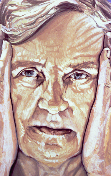 I bustled into the theatre next day, clutching a disheveled portfolio of work. Aarne Neemi, Director of the Hunter Valley Theatre Company, inspected the work over an ironing board, balancing prints on a sewing machine. He liked the work and said the job was to paint Photo Realist people up and down the stairwell. The dreaded money issue was the next problem and with sweaty hands and embarrassed silences, I gave my quote. Stunned silence - rethinking was needed - price too high - cynically, I found myself thinking “another labour of love”. A night of pondering and considering the possibilities of such a mural - I was excited by the idea, the size, the public access to it, the chance to get back into painting after a year of printmaking I work for Newcastle-Out-of-Workers (NOW.) tutoring Art and Craft on Fridays and Etching on Thursdays. Last year we renovated a room at their centre at Fort Scratchley and painted a mural on the ceiling. I approached Maureen Tredinnick, a project officer with NOW. about this job to see whether we could make it a project for the art class. Since one of the aims of NOW. is to reach out into the community, she readily agreed. The people in my class liked the idea, so I asked for volunteers. I phoned Aarne Neemi, whose response to the idea was, in his own words, “Let’s do it”. A rough plan was made, paints were bought and the job started 10 a.m. Monday. This decision and process took six days. ‘Fools enter where wise men and women dare not!’ I met Janice Prince, one of the out-of-workers and between us we unscrewed all of the partitions on the stairs. Janice is a stunning- looking lady, and in her hot pants, was the reason for a lot of the attention we attracted, a taste of public working that was to become common-place over the many weeks ahead. With a couple of sanding machines, we worked away. The height of the walls presented a real problem. It was impossible to set up stable scaffold on the stairs and its cost too prohibitive as a serious consideration. Panic at the extent of the project - it seemed to be growing by the moment. A couple of tough working-class punks came in off the street and offered to help, “at a price”. We talked to them for a while and they agreed to help sand the more inaccessible heights. They were out of work, had just thumbed down from Brisbane, were broke and looking for work. That’s how we met Matthew Ayres. He came in and worked for the next few weeks, especially clambering up the ladders - when he didn't’ have a mad crush on Janice.