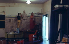 To draw up the people, I had first to find the models from friends,theatre company and general public walking past the front of the Civic Playhouse. We posed them on the stairwell as I needed to get the angle of viewing and feet positions right and the same light source.To transfer the drawing onto the wall was difficult.It was before I reinvented a paper transfer method. Allen Chawner made me black and white slides which I then projected into a mirror which bounced the images onto the wall.There was not enough distance to do large scale direct projection. Distortion was a bit of a problem but it generally worked . This job was were I learnt all about murals. It took me about 10 months or more to do. The budget barely covered materials.I found myself working in unsafe conditions, day and night, without wages. One night I had been up on a ladder for hours,it was in the middle of the night and when I came down my ankles collapsed under me. I had to crawl to a telephone to get rescued.The theatre company also worked on tight budgets and really when I started I had no idea what it would involved or how long it would take. This was my steepest learning curve and It helped give me a life's work. The issue of artists work and making a basic living wage is one we all face and struggle with.During the next few years I managed to find ways to support myself doing murals,banners and some part time teaching.