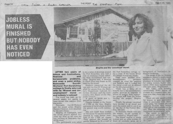 AFTER two years of delays and frustrations, financial and bureaucratic problems, and even a paint strike, Newcastle Out-Of- Workers’ Fort Scratchley cottage Is finally adorned with its ‘Women and Unemployment’ mural — and nobody’s noticed! The mural has been up for several weeks but seems to have stirred little reaction from the public.