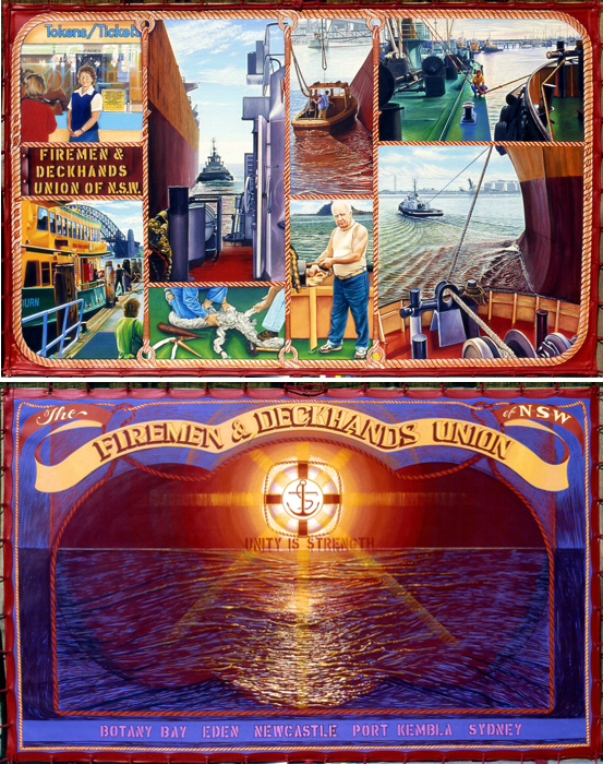1991 "Printing and Kindred Industries Union". Double Sided. 2m x 2.5m. Sydney. This was fully funded by this union. I commuted to Sydney to do this banner. Down on the trains then to be driven out to worksites.I became caught in one of Sydney's worst storms one night and I had to stay for a morning appointment. I was soaking wet and it was pouring down so I went into the nearest hotel. It was the dirtiest doss house I'd ever stayed in. Someone had defecated on the shower floor, I waited till the rain had stopped and spent the night walking Sydney and sitting at Central Railway Station with all the other homeless people. The traditional use of chapels, mother and father of the chapel, terms to describe union organizers were uniquely still used.I personally related to the skill base of members and loved seeing the old presses, engraving tools and print sets. In one paint mixing factory the walls and floors where like a giant Jackson Pollock painting with a coloured man moping the paint of the floor. The industry was rapidly changing, new technologies were changing the skill base and amalgamations between unions were happening I remember how much against this the printers where. In the front side of this banner I was able to incorporate the old with the new . On the back I featured a old printer instructing a new female member on the history and the rules of this union looking back at some of the struggles and street marches. This was the last trade union banner I painted. 10 years. I have since read you get 10 years in art at a cutting edge, you go along at a frantic pace pushing yourself and developing ideas and becoming a expert then suddenly its over.