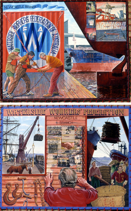 1988 "Waterside Workers Federation". Double Sided. 1.8m x 2.m Artist in resident program for Trades Hall Council. I supervised a full time trainee,who painted a banner for the "Australian Metal Workers Union (AMWU)" banner - Upper Hunter. Artist - Alaide MarcelI. Which I did poorly as I was still not well after Tasmania. I painted this banner in a lunch room over looking the loading wharf in Newcastle. During the Bicentennial Celebrations Queen Elizabeth's ship was moored right under my window.I waved. .A decision was made to have the history of the union up until 1967 on one side of the banner and contemporary images emphasizing containers on the other ... I designed the old side of the banner with three equal sections. In the first I made a window for the old scene. In the middle I constructed the inside of a shed with leaflets, union history and newspaper clippings collaged on the old wooden wall with a man reading the material and symbolically breaking the chains of his repression. An open doorway looks out onto a scene of men working. The modern side was more pragmatic, the work force were working in well paid positions and the romance of the industry had diminished. large numbers had been retrenched with new technologies in exchanged for better conditions. Watching containers being loaded was boring. The waterside union had always been a strong and clannish union, a mastership culture surviving in suburbs around the docks. I also